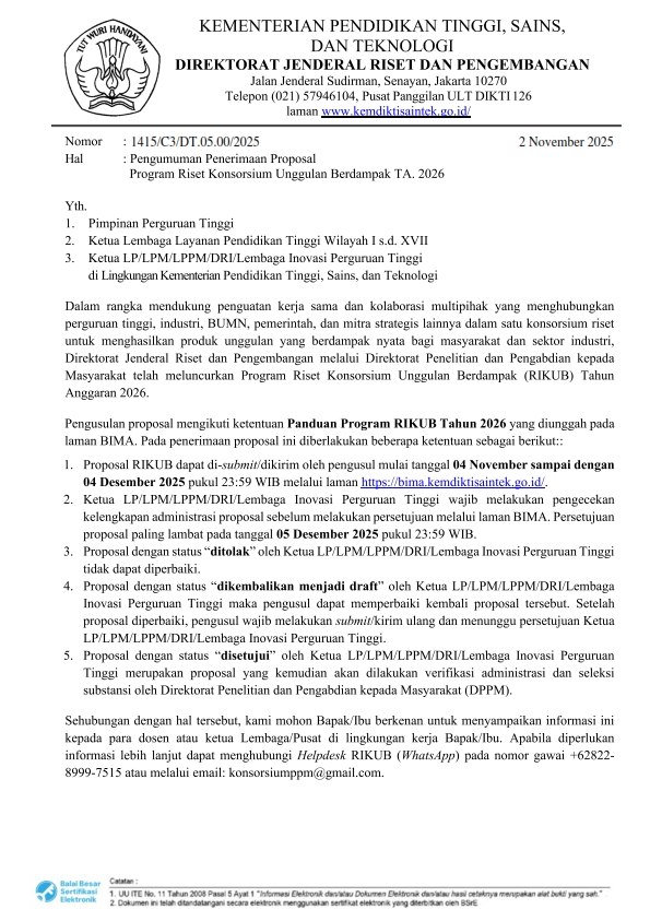 Posted on 09/Nov/202509/Nov/2025 by Izaac RuntulaloPengumuman Penerimaan Proposal Program Riset Konsorsium Unggulan Berdampak TA. 2026 Yth Bapak/Ibu Dosen Universitas Sam Ratulangi Berikut disampaikan informasi dari Dirjen Riset dan Pengembangan Kementerian Pendidikan Tinggi Sains dan Teknologi sebagai berikut: