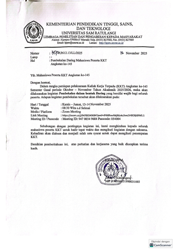 Dalam rangka persiapan pelaksanaan Kuliah Kerja Terpadu (KKT) Angkatan ke-145 Semester Gasal periode Oktober – November Tahun Akademik 2025/2026, maka akan dilaksanakan kegiatan Pembekalan dalam bentuk Daring yang bersifat wajib bagi seluruh peserta. Adapun kegiatan pembekalan tersebut akan dilaksanakan pada: