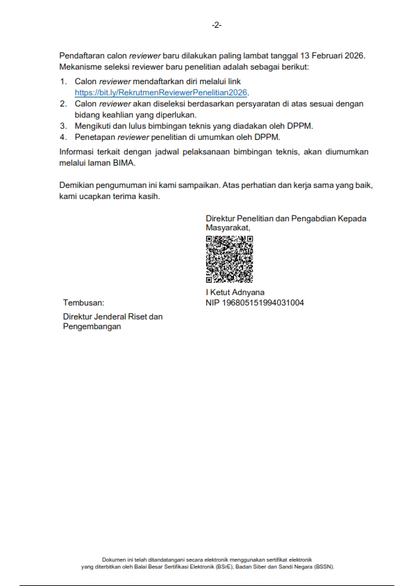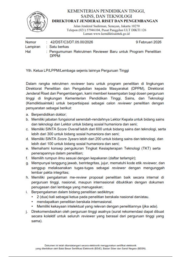 Melanjutkan informasi dari Direktur Penelitian dan Pengabdian Kepada Masyarakat, Kementerian Pendidikan Tinggi, Sains dan Teknologi bersama ini kami informasikan sebagai berikut: