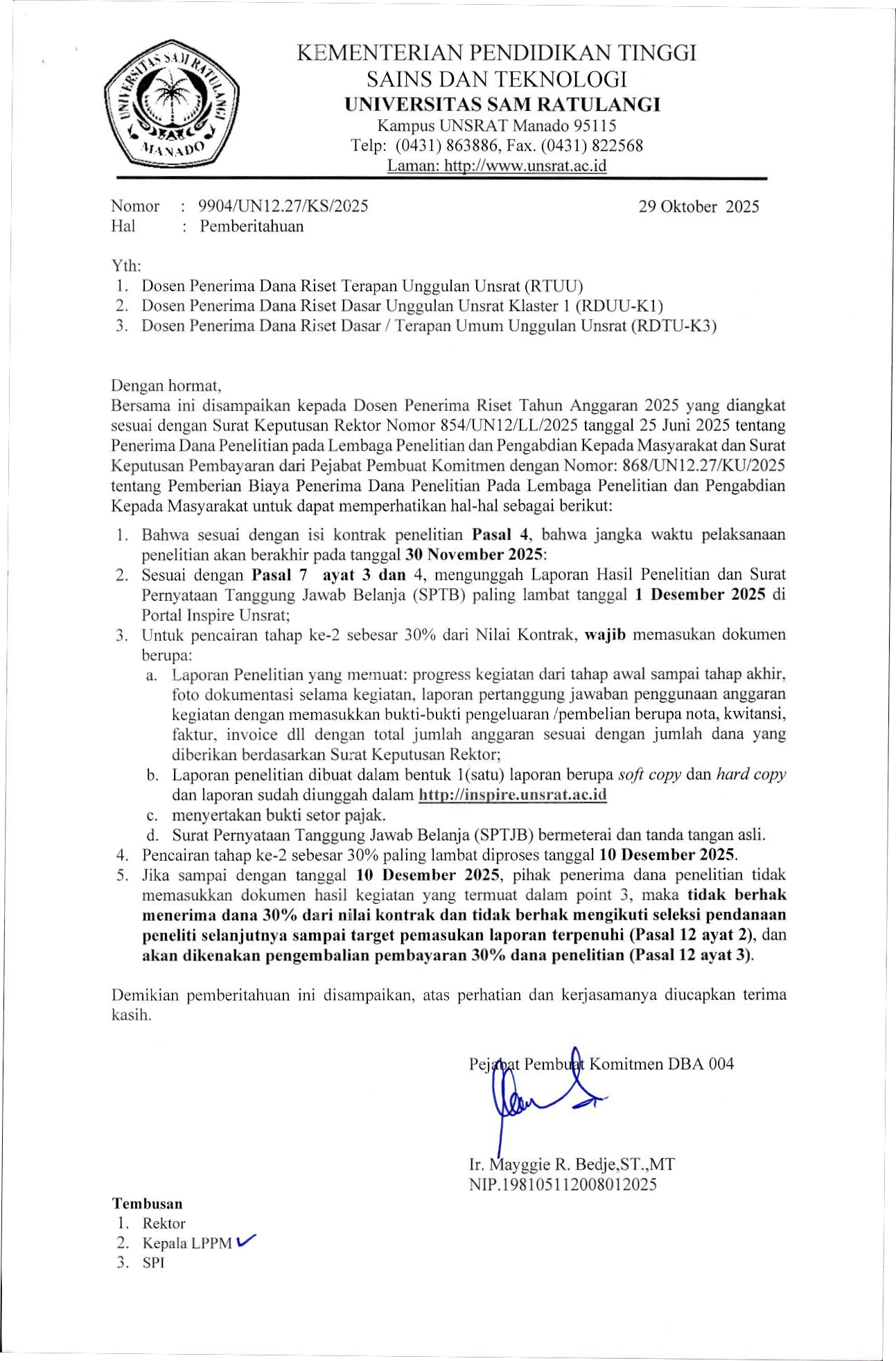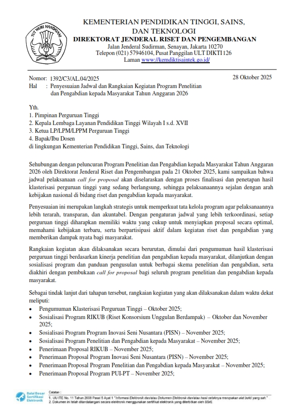 Berdasarkan Surat No 2981 tanggal 30 September 2025 tentang Pemberitahuan Pelaksanaan Monitoring dan Evaluasi Kegiatan Penelitian, bersama ini kami sampaikan jadwal pelaksanaan kegiatan dimaksud dengan memperhatikan hal berikut: