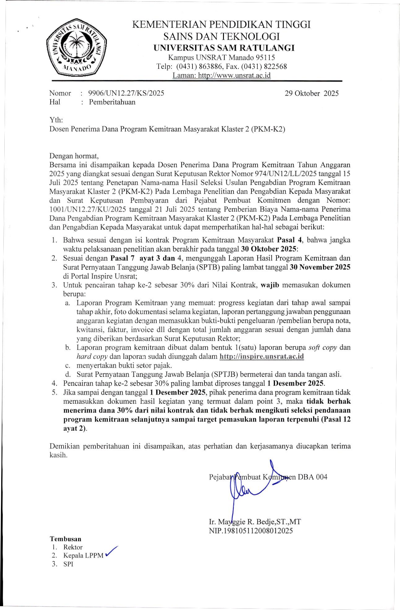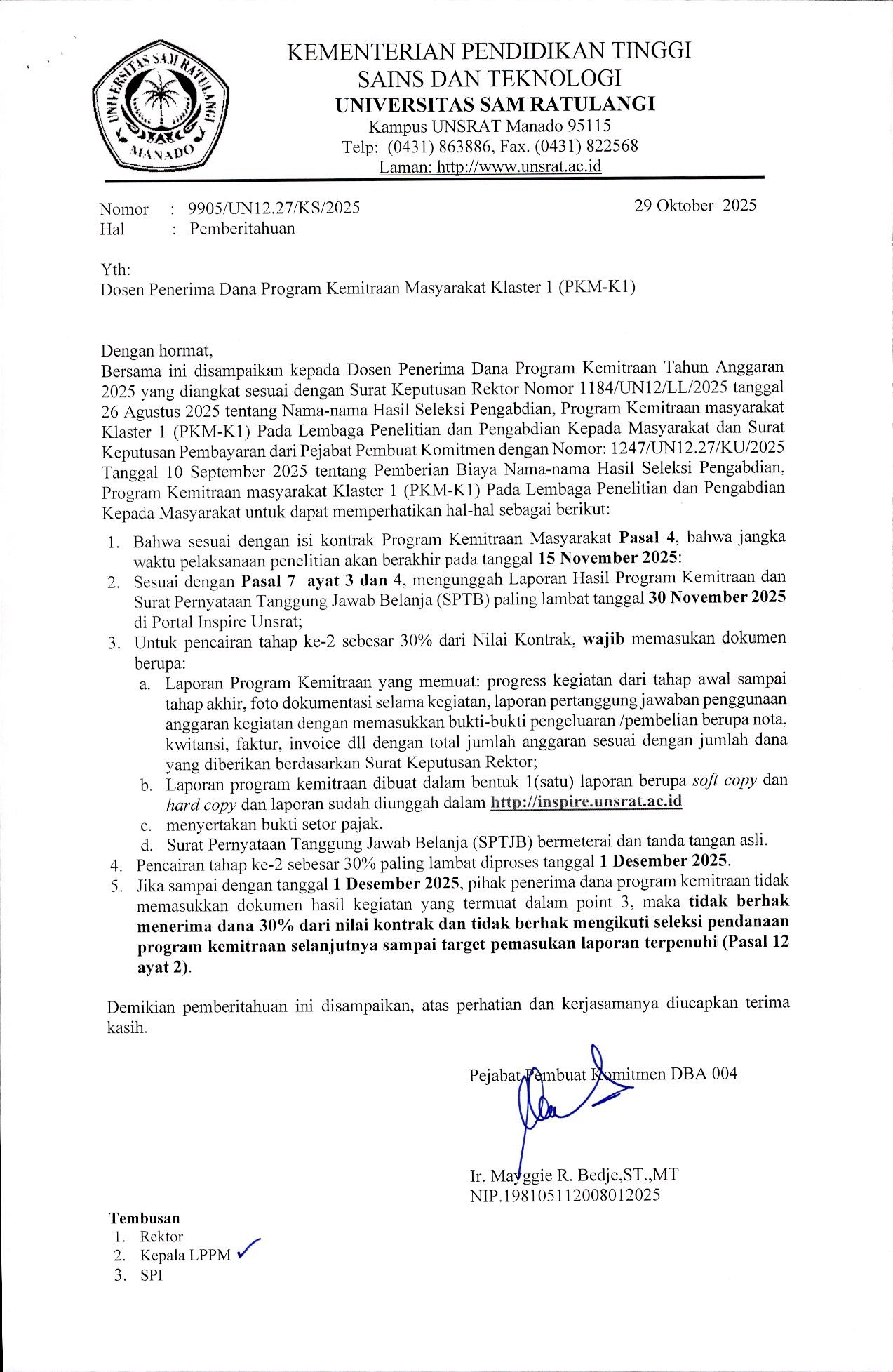 - Informasi/Penjelasan lainnya dapat diperoleh pada Sekretariat Panitia Pelaksana Kuliah Kerja Terpadu Angkatan ke 145 Tahun 2025, di Gedung LPPM lantai 4 UNSRAT, atau di laman; http//lppm.unsrat.ac.id.